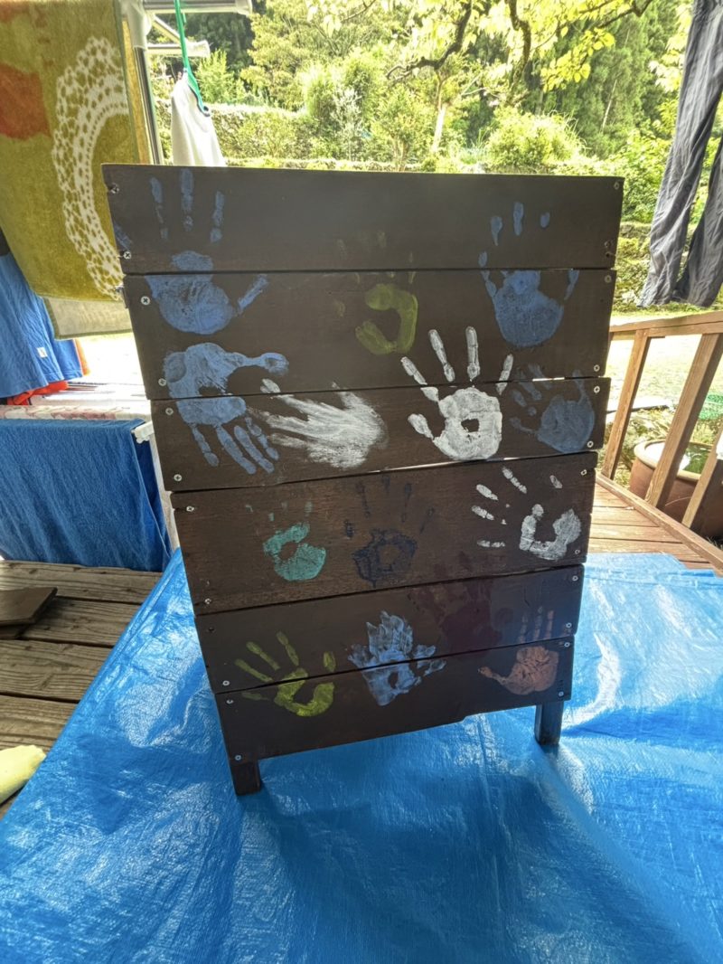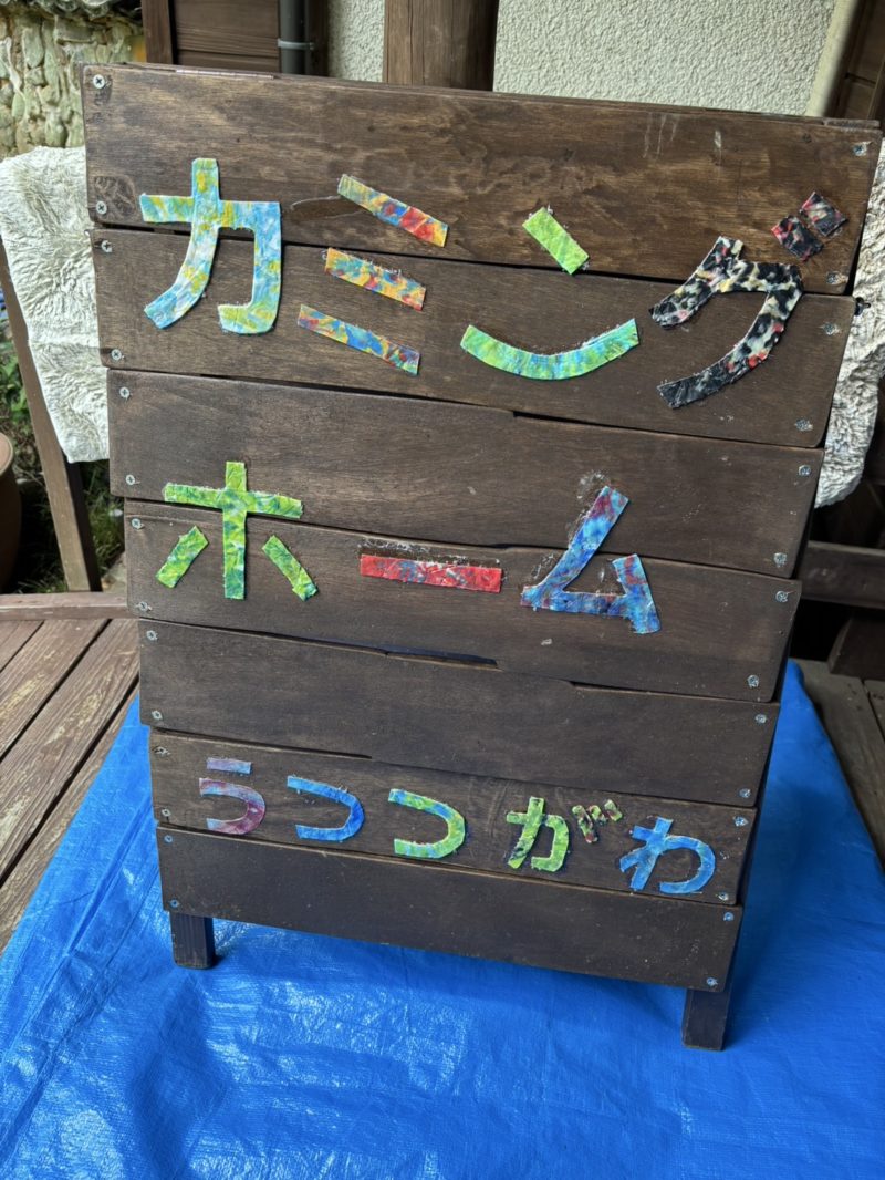 カミングからは『ようこそ カミングへ☆』と廃材である木材とペットボトルキャップを使って、移動式の看板を作りました👨👩👧👦
